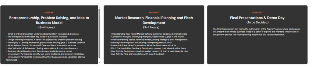 Most aspiring founders face common startup challenges—no clear roadmap, weak business models, poor market validation, and limited financial planning. Aspire solves these problems through expert-led sessions, live projects, and real-time feedback, so you don’t just dream—you execute.